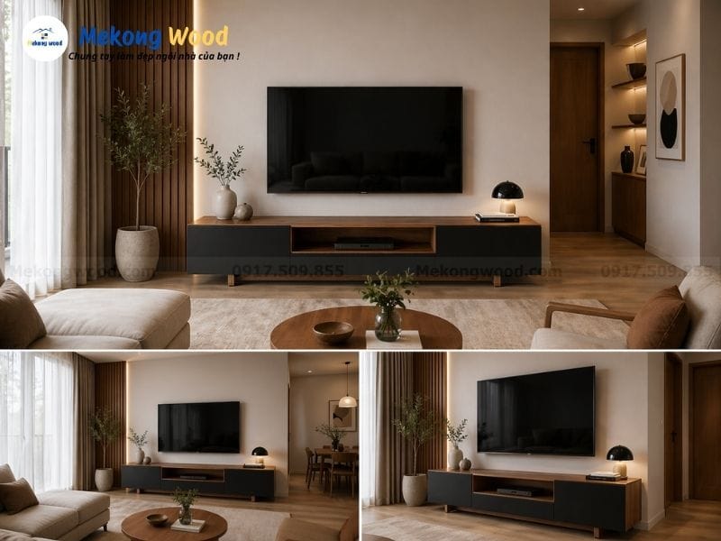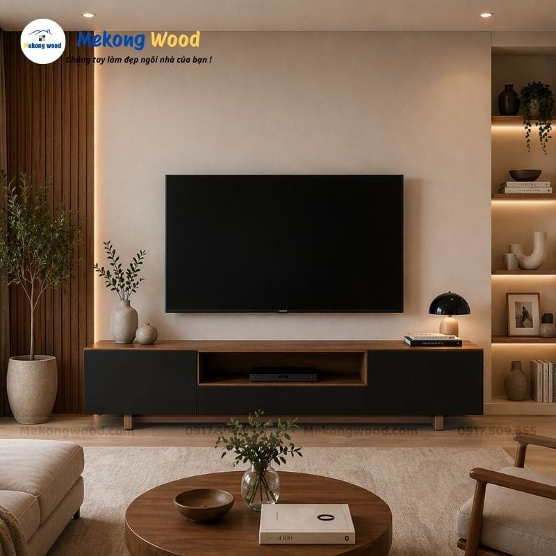 Nếu Anh chị đang tìm kiếm một mẫu kệ tivi vừa vặn cho căn hộ chung cư hoặc phòng khách nhỏ mà vẫn toát lên vẻ sang trọng, tinh tế thì đây chính là sự lựa chọn không thể bỏ qua. Với sự kết hợp hoàn mỹ giữa tông màu gỗ trầm ấm và sắc xanh đen thời thượng, mẫu kệ này mang đến hơi thở hiện đại và cá tính cho nội thất phòng khách .
