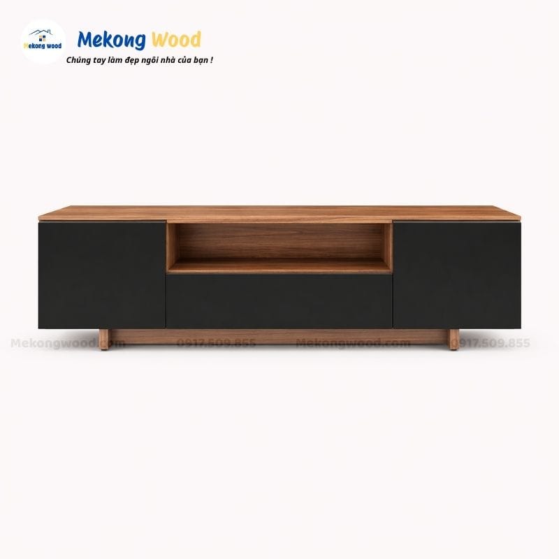 - Cấu Trúc Thông Minh: Thiết kế bao gồm các ngăn kéo kín để đồ đạc gọn gàng và ngăn kệ hở ở giữa, thuận tiện cho việc đặt đầu thu, loa thanh hoặc các vật dụng trang trí thường dùng.