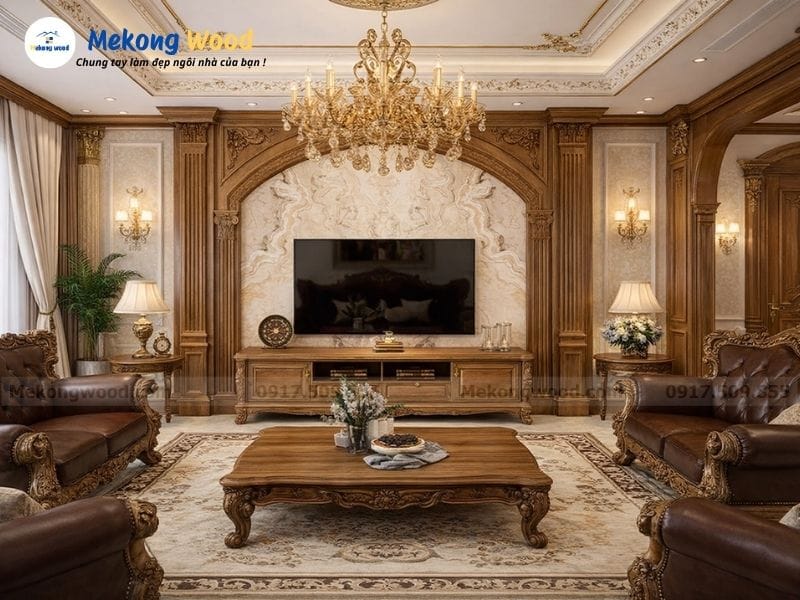 Mẫu vách tivi tân cổ điển gỗ tự nhiên là sự giao thoa hoàn mỹ giữa chất liệu gỗ tự nhiên thượng hạng và tinh hoa kiến trúc Châu Âu, mang lại vẻ đẹp quyền uy và bền vững cho không gian phòng khách.