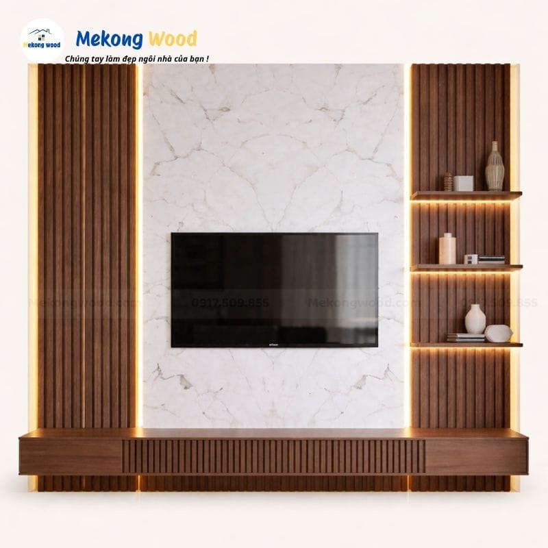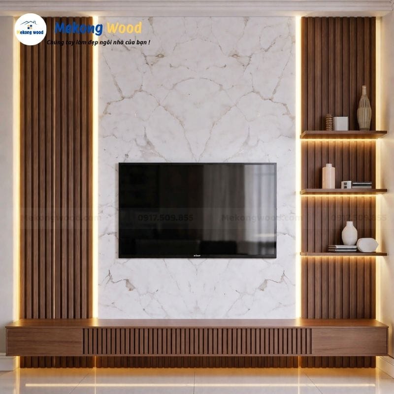 Nâng tầm đẳng cấp không gian phòng khách với mẫu vách tivi lam sóng và tấm ốp vân đá pvc sang trọng . Giải pháp thi công hiện đại từ Mekong Wood giúp phòng khách thêm tinh tế, bền bỉ và lung linh dưới ánh đèn LED.